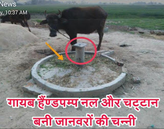 तभी मेरी नजर एक हैंडपम्प नल पर पड़ी जो नल आधा गायब था और विगत बर्षों से बिगड़ा पड़ा था उस नल की किसी को फिक्र ही नही लोगों को पानी भरने की कितनी तकलीफ होती है यह सब जानने को जैसे ही मैं वहां नल की हॉलात देखने को रूका तो देखा कि नल की चट्टान टूटी है और जानवरों की चन्नी (जारा जालने की जगह) हो गयी है मैं फोटो निकाल ही रहा था तब तक मुझे देखते ही गांव के कई लोग हमारे पास आ गये और मेरा हॉल चाल लिया मैंने भी उन लोगों से बातचीत की फिर क्या हमें तो अपनी ग्रामसभा की खामियां जो दिख रहीं थी