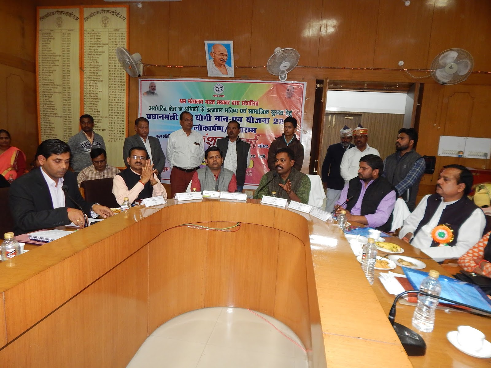 श्रमेव जयते के तहत श्रम मंत्रालय भारत सरकार द्वारा अंसगठित क्षेत्र के श्रमिकों के उज्ज्वल भविष्य एवं सामाजिक सुरक्षा हेतु संचालित प्रधानमंत्री श्रम योगी मान-धन योजना का लोकापर्ण/शुभारंभ कलेक्टेªट सभागार में आयोजित कार्यक्रम में मुख्य अतिथि रूप में मा0 सांसद अंशुल वर्मा ने दीप जलाकर एवं मां सरस्वती के चित्र पर माल्यार्पण कर किया। इस अवसर मा0 सांसद ने कहा कि मा0 प्रधानमंत्री जी द्वारा चलाई गयी यह योजना असंगठित कर्मकारों को अपनी आयु के 60 वर्ष पूरे होने पर 3000रू0 मासिक पेंशन मिलेगी जो उनके भविष्य को उज्ज्वल बनायेगा।