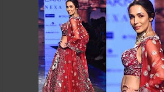 लैक्मे फैशन वीक के तीसरे दिन बॉलीवुड एक्ट्रेस मलाइका अरोड़ा रैंप पर खूबसूरत दुल्हन के जोड़े में रैंप पर उतरीं। वैलेंटाइंस डे पर मलाइका लाल लहंगे में काफी सुंदर नजर आ रही हैं। लहंगे में सिल्वर वर्क किया गया है। एक्सेसरीज में मलाइका ने चोकर नेकपीस पहना हुआ है, जिसमें काफी सारे गेमस्टोन लगे हैं। ये सुंदर सा चोकर नेकपीस उनके आउटफिट के साथ परफेक्ट स्टाइल स्टेटमेंट एक्सेसरीज है।