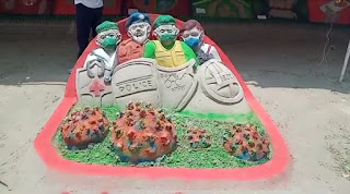 कोरोना वायरस ( कोविड 19 ) से कैसे बचा जाय। इसके लिए हर तरह के जागरूक व सुझाव सरकार के द्वारा दिये जा रहे हैं। इसी परिप्रेक्ष्य में बलिया के बासडीह स्थित तहसील के खरौनी गाँव में सेंड आर्टिस्ट रूपेश कुमार सिंह ने कोरोना उ। योद्धाओं को सफेद बालू पर लगभग 60 फिट लम्बाई में अपनी कला कृतियों के माध्यम से चित्रण कर सम्मान दिया है। वहीं अनोखा जागरूकता भी किया है। उन्होंने अपने कलाकृतियों के माध्यम से रेत पर बना कर दिखाया कि कोरोना कहां से चला और और कैसे पूरे देश में फैल गया। वाराणसी काशी विद्यापीठ में फाइन आर्ट्स के अध्ययनरत छात्र रूपेश की माने तो कोरोना महामारी में दिन रात मेहनत करने वाले उन योद्धाओं को जिन्होंने कोरोना संक्रमण में जोखिम उठाकर सेवा दिया है। यही मेरा सम्मान है। उन्होंने इस सैंड आर्ट को लगातार 15 दिन कठिन परिश्रम के बाद जाकर तैयार हुआ।
