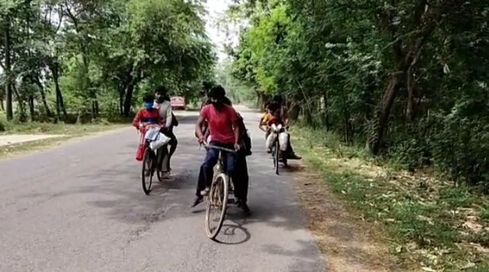वीओ लॉक डाउन एक हो या लॉक डाउन चार , सड़को पर हजारों किलोमीटर से पैदल व साईकिल से चल कर अपने घर तक पहुंचने का नज़ारा सरकार के लाख कोशिशों के बाद भी जस का तस बना हुआ है। ताजा मामला नरही थाना अंतर्गत सोहव गांव से होकर बक्सर बिहार जाने वाली सड़क का है जहाँ डेढ साल की मासूम को लिए कुल 9 लोग पैदल व साईकिल से चल कर पहुंचे। इन श्रमिको की माने तो दिल्ली से चल कर नरही थाना क्षेत्र अंतर्गत सोहाव पहुचे है जिन्हें बिहार बक्सर जिले के राजपुर थाना जाना है वही बीच सड़क पर कोई साधन और सुविधा न मिलने के कारण घर पहुचने के लिए अपने पैसे से साईकिल खरीद कर सफर को तय किया । इस सफर को पूरा करने में महीने के आधा से अधिक दिन निकल गये। बदन को जला देने वाली चिलचिलाती धूप में डेढ साल की मासूम बच्ची को लिए ये लोग सिर्फ अपने घर तक हर हाल में पहुंचने का जज्बा लिए चल पड़े है। ये नज़ारा देख स्थानीय लोगो ने इन्हें खाना खिलाया तो किसी ने बच्ची को मुरही और दूध का बन्दोवस्त किया। आप को बातते चले कि सरकार का सख्त आदेश है कि कोई भी श्रमिक पैदल न चले और न ही ट्रांसपोर्टिंग की गाड़ियों से सफर करें बावजूद यह नज़ारा न आप को हैरान कर सकता है बल्कि विचलित भी कर सकता है।