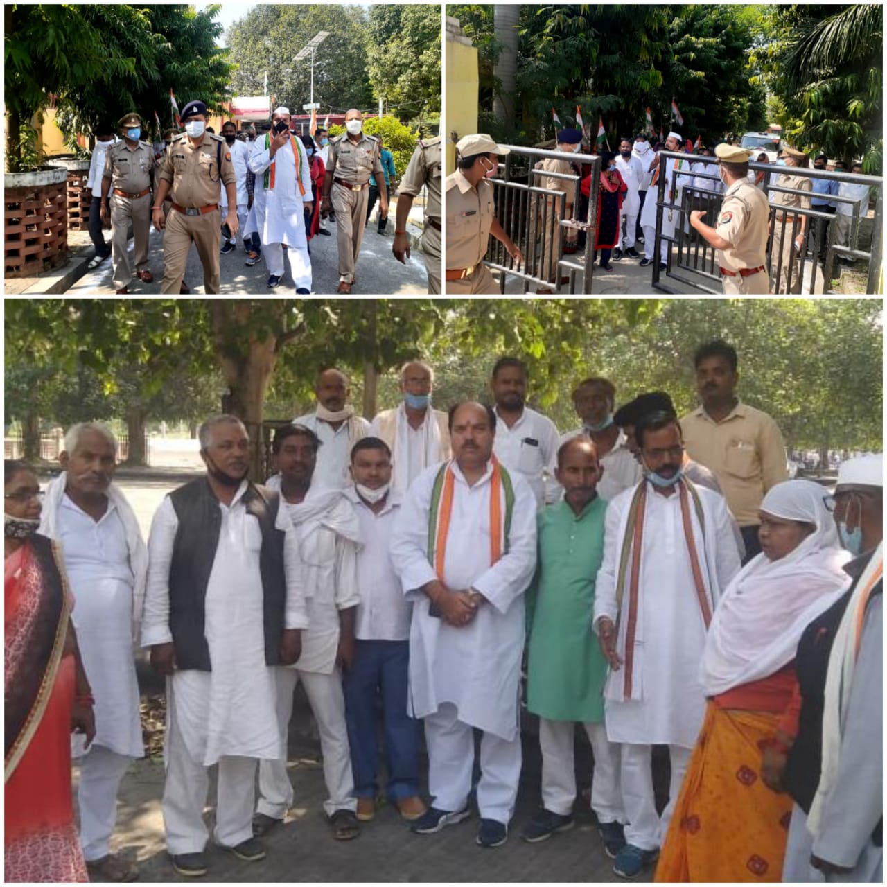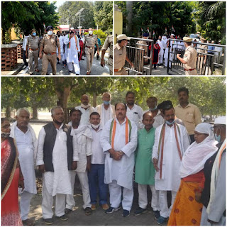 लखनऊ। मोहनलालगंज राष्ट्रपिता महात्मा गांधी और पूर्व प्रधानमंत्री लालबहादुर शास्त्री जी की जयन्ती पर शुक्रवार को लखनऊ जनपद के सभी आठ ब्लाक में दोनो महात्मा के चित्र और शहीद स्मारक पर पुष्पांजलि भेंटकर नमन करते हुए जिलाध्यक्ष कांग्रेस वेद प्रकाश त्रिपाठी की अगुवाई में कांग्रेस कार्यकर्ताओं ने प्रभात फेरी के रुप में शान्ति मार्च निकाला। मोहनलालगंज में शान्ति मार्च की कमान जिलाध्यक्ष ने स्वयं संभाली उनके साथ कांग्रेस नेता नरेन्द्र गौतम ,हसमुद्दीन ,कन्हैया तिवारी और देवतादीन समेत सैकड़ों कांग्रेसी मौजूद रहे। रघुपति राघव राजाराम गाते हुए शान्ति मार्च निकाल रहे कांग्रेस कार्यकर्ताओं को पुलिस ने ब्लाक के गेट पर ही रोंक कर आगे जाने की अनुमति नही दी। इसलिए जिलाध्यक्ष के नेतृत्व में पैंतीस कांग्रेस कार्यकर्ताओं ने पुलिस को अपनी गिरफ्तारी दी। इसी तरह गोशाईगंज ब्लाक में भी शान्ति मार्च निकाल रहे पच्चीस कांग्रेस कार्यकर्ताओं ने पुलिस के रोंकने पर गिरफ्तारी दी। अन्य ब्लाक में भी शान्ति मार्च निकालने को लेकर इसी तरह कांग्रेस कार्यकर्ताओं और पुलिस में तीखी नोंक-झोंक हुई। कांग्रेस जिलाध्यक्ष वेद प्रकाश त्रिपाठी ने शान्तिपूर्ण तरीके से प्रभात फेरी निकाल रहे कांग्रेस कार्यकर्ताओं को जबरन रोंकने को लेकर प्रदेश सरकार की कड़ी आलोचना की। पुलिस और प्रशासन के जरिए सरकार पर आमजन की आवाज को दबाने का आरोप लगाकर जिलाध्यक्ष ने इसे लोकतंत्र की हत्या करार दिया।